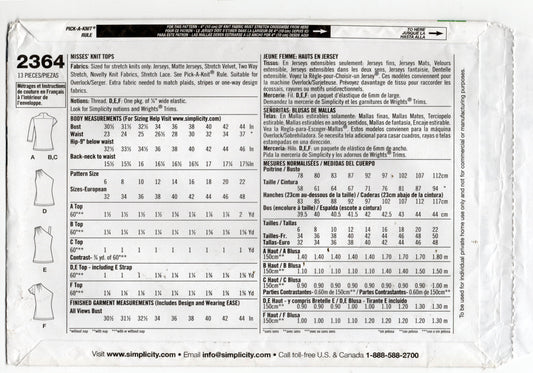 Patrón de costura para blusas elásticas para mujer Simplicity 2364 con variaciones en las mangas, talla 6 a 14, sin cortar, dobladas de fábrica