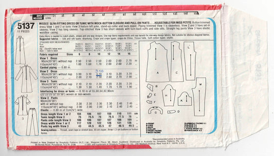 Patrón de costura vintage de los años 80 para vestido o túnica estilo cheongsam para mujer Simplicity 5137, top y pantalones, talla 10, busto 32,5 pulgadas