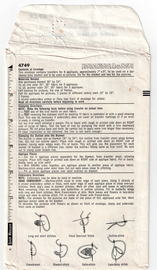Simplicity 4749 RARE Baby Blanket Applique Animal Transfers 1960s Vintage Sewing Pattern ONE SIZE UNUSED Factory Folded