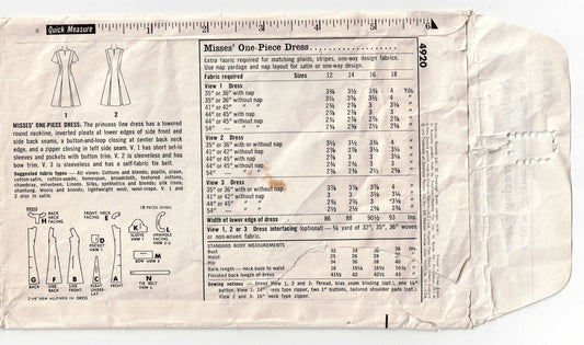 Patrón de costura vintage de los años 60 para vestido de princesa con pliegues invertidos Simplicity 4920, para mujer, talla 18, busto de 38 pulgadas