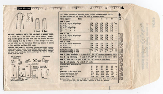 Patrón de costura vintage de los años 60 para vestido de maternidad Simplicity 4827, falda y top, talla 14, busto 34 pulgadas