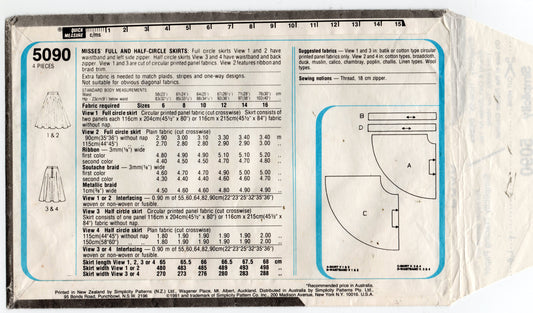 Patrón de costura vintage de los años 80 para faldas de círculo completo o semicirculares para mujer Simplicity 5090, talla 12, cintura 26,5 pulgadas