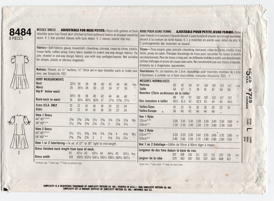 Patrón de costura para vestido de cintura baja con mangas abullonadas para mujer Simplicity 4848, estilo vintage de los años 80, talla 10-14