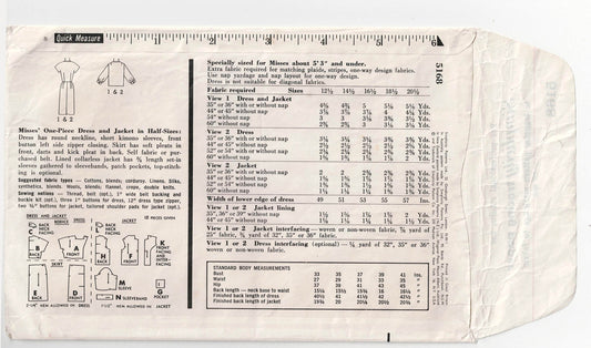 Simplicity 5168 Womens Half Size Sheath Dress & Short Jacket 1960s Vintage Sewing Pattern Bust 39 inches