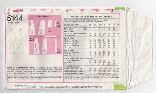 Conjunto de faldas Simplicity 5144 para mujer en 2 largos, patrón de costura vintage de los años 70, talla 8, sin cortar, pliegues de fábrica