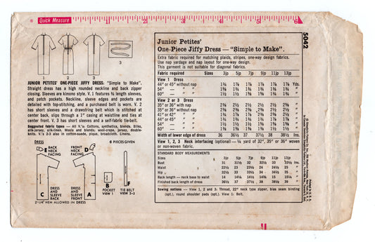 Patrón de costura vintage de los años 60 para vestido JIFFY de Simplicity 5042 Junior Petite, talla 11, busto 33 pulgadas
