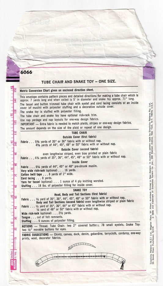 Patrón de costura vintage de los años 70 sin cortar y doblado de fábrica Simplicity 6066 Tube Chair & Snake Toy