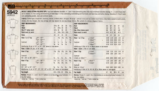 Patrón de costura vintage de los años 80 para blusas tipo jersey con broches en los hombros para mujer Simplicity 5942, talla 12, busto de 34 pulgadas
