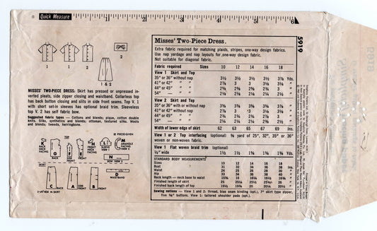 Patrón de costura vintage de los años 60 para blusa princesa y falda plisada para mujer Simplicity 5919, talla 12, busto 32 pulgadas