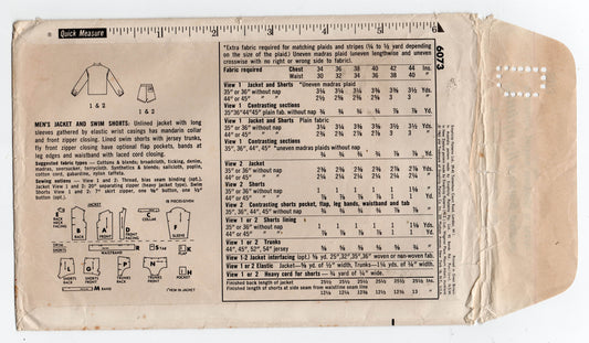 Patrón de costura vintage de los años 60 para chaqueta bomber y bañador retro clásico Simplicity 6073 para hombre, pecho 36"/ cintura 32" SIN USAR, doblado de fábrica