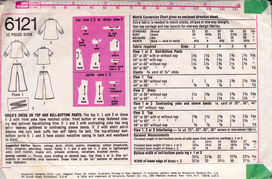 Patrón de costura vintage de los años 70 para vestido y pantalón retro para niñas pequeñas Simplicity 6121, talla 4, pecho de 23 pulgadas
