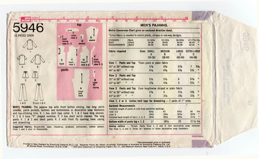 Patrón de costura vintage de los años 70 Simplicity 5946 para pijamas de hombre, 3 estilos, talla MEDIANA, pecho de 38 a 40 pulgadas