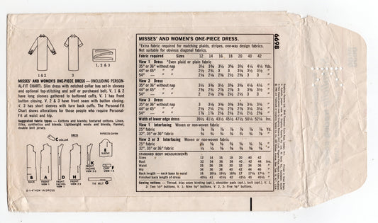 Patrón de costura vintage de los años 60 para vestido camisero clásico de mujer Simplicity 6698, busto de 34 o 36 pulgadas