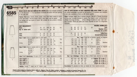 Patrón de costura vintage de los años 80 Simplicity 6585 para mujer CONNOISSEUR COLLECTION, faldas con corte al bies y forro, talla 12, doblado de fábrica