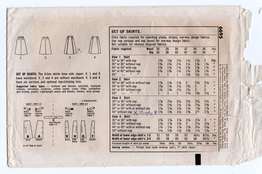 Patrón de costura vintage de los años 60 para faldas clásicas de corte A para mujer Simplicity 6695, cintura de 26 pulgadas