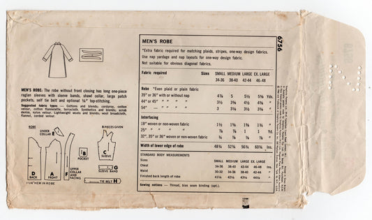 Patrón de costura vintage de los años 60 para bata o bata con cuello chal para hombre Simplicity 6756, talla MEDIANA, pecho de 38 a 40 pulgadas, sin cortar, doblada de fábrica