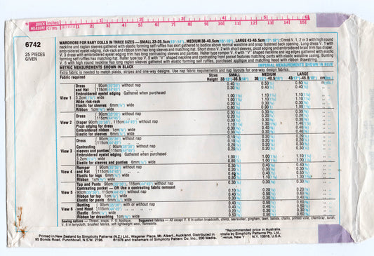 Patrón de costura vintage de los años 70 Simplicity 6742 para guardarropa de muñecas de 17 a 18 pulgadas, estilo retro, talla GRANDE