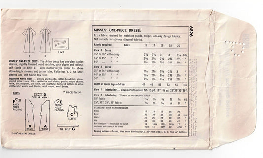Patrón de costura vintage de los años 60 para vestido recto con mangas raglán Simplicity 6896 para mujer, talla 14, busto 34 pulgadas