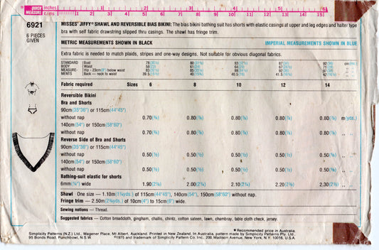 Patrón de costura vintage de los años 70 para bikini y chal de playa reversible con cuello halter JIFFY para mujer de Simplicity 6921, talla 10 o 12