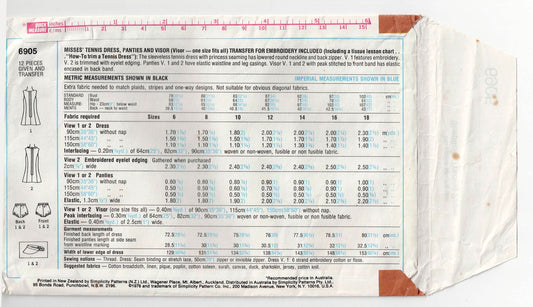 Patrón de costura vintage de los años 70 para vestido de tenis con visera y bragas para mujer Simplicity 6905, con transferencia de bordado, talla 12, busto de 34 pulgadas