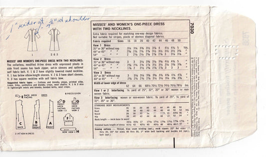 Patrón de costura vintage de los años 60 Simplicity 7030 para vestido de mujer, corte en A, con pliegues en la falda y dos escotes, busto de 42 pulgadas