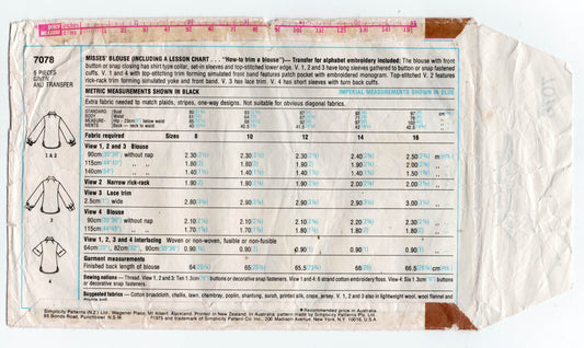 Patrón de costura vintage de los años 70 para camisa con monograma para mujer Simplicity 7078, talla 10, busto 32,5 pulgadas