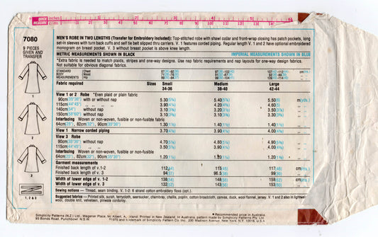 Patrón de costura vintage de los años 70 para bata de cuello chal para hombre Simplicity 7080, talla grande, pecho de 42 a 44 pulgadas