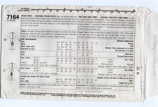 Patrón de costura vintage de los años 80 para vestido blusón con pliegues en la parte posterior de la falda para mujer Simplicity 7164, talla 12, sin cortar, doblado de fábrica