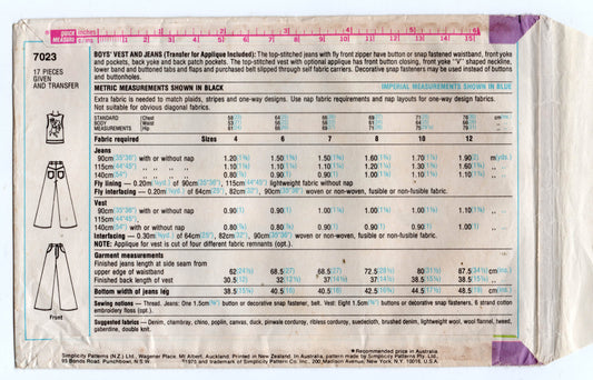 Patrón de costura vintage de los años 70 para chaleco vaquero y pantalones acampanados para niños Simplicity 7023, tallas 7 y 8, sin cortar, doblado de fábrica