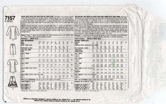Patrón de costura vintage de los años 90 Simplicity 7157 para chaqueta larga con dobladillo curvo y falda acampanada o ajustada para mujer, talla 8 a 14, sin cortar, doblado de fábrica