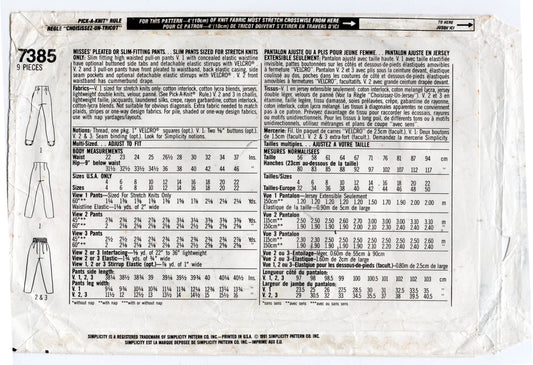 Patrón de costura vintage de los años 90 para pantalones plisados o elásticos de cintura alta para mujer Simplicity 7385, talla 8 a 16, doblado de fábrica sin cortar
