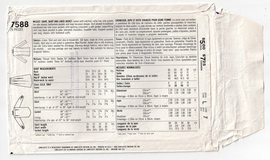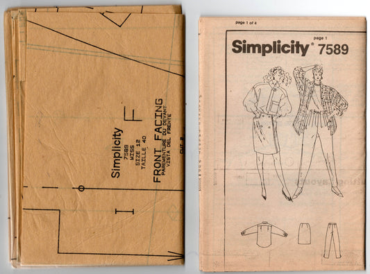 Patrón de costura vintage de los años 80 para falda y chaqueta forrada de camisa SUNG SPORT para mujer Simplicity 7588, talla 12, sin cortar, doblado de fábrica