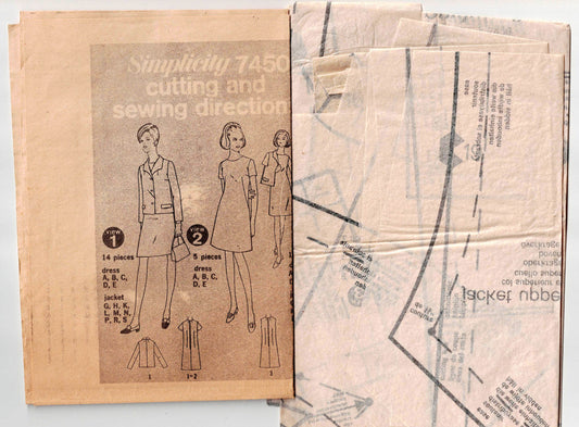 Patrón de costura vintage de los años 60 para vestido recto y chaqueta corta para mujer Simplicity 7450, talla 14 o 18