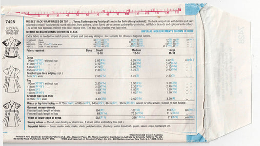 Simplicity 7428 Womens Back Wrap Dress & Top with Embroidery Transfer 1970s Vintage Sewing Pattern Size LARGE 16-18 UNCUT Factory Folded