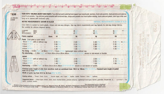 Simplicity 7638 Teen Boys Denim Jacket & Pants 1970s Vintage Sewing Pattern Size 14 & 16 UNCUT Factory Folded