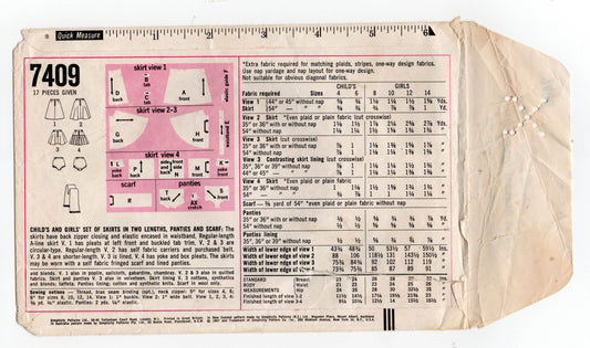 Patrón de costura vintage de los años 60 para faldas, bragas y bufandas para niñas Simplicity 7409, talla 6