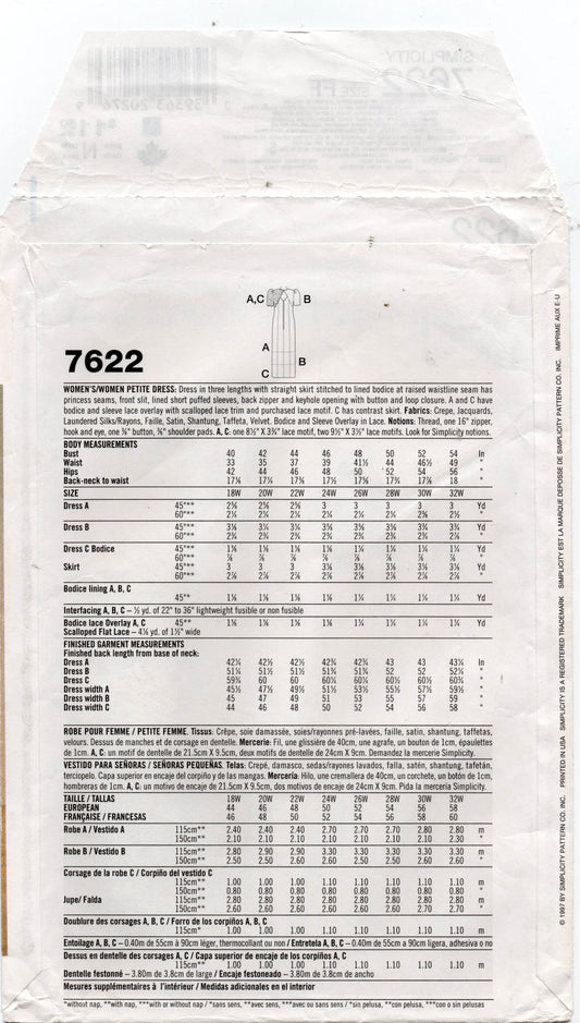 Patrón de costura vintage de los años 90 para vestido de talle imperio para mujer Simplicity 7622 JESSICA McCLINTOCK, tallas 18W - 24W, sin cortar, doblado de fábrica