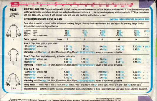 Patrón de costura vintage de los años 70 Simplicity 7636 para blusas estilo hippie para niñas, tallas 7 y 8, sin cortar, dobladas de fábrica