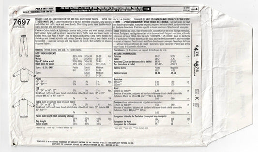Patrón de costura vintage de los años 80 para mujer Simplicity 7697, túnica elástica para ropa deportiva y pantalones con estribos, talla MEDIANA SIN CORTAR, doblado de fábrica
