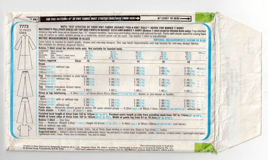 Patrón de costura vintage de los años 70 para vestido y pantalón de maternidad Simplicity 7773 + camiseta de bebé de regalo, talla 14, busto de 36 pulgadas, sin cortar, doblado de fábrica