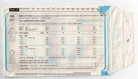 Patrón de costura vintage de los años 70 para vestido con mangas raglán y cremallera delantera JIFFY para mujer Simplicity 7792, talla 14, busto 36 pulgadas