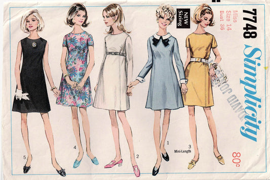 Simplicity 7748 Womens Princess Shift Dress with Detachable Collar & Cuffs 1960s Vintage Sewing Pattern Size 14 Bust 36 Inches