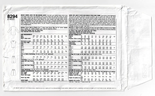 Patrón de costura vintage de los años 90, sin cortar, doblado de fábrica, chaqueta, top, pantalones cortos y falda, para guardarropa de mujer Simplicity 8294