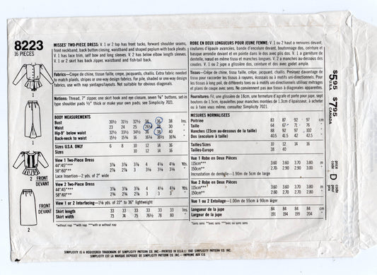 Patrón de costura vintage de los años 80 Simplicity 8223 para mujer de Jessica McClintock, top peplum y falda de cola de pez, talla 12