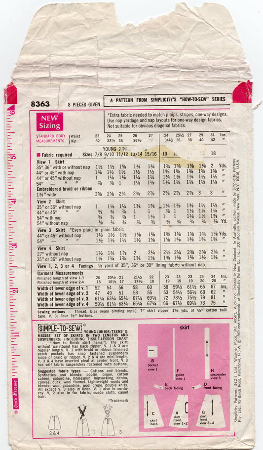 Patrón de costura vintage de los años 60 para faldas con tirantes Simplicity 8363 para mujer, 2 largos, cintura de 29 pulgadas