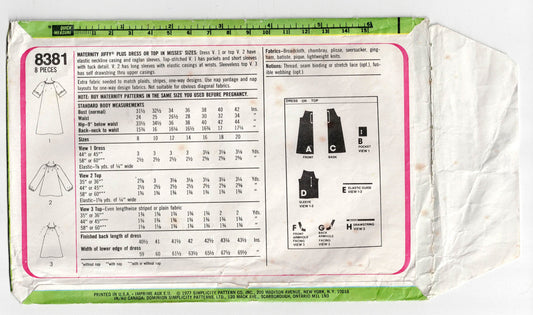Patrón de costura vintage de los años 70 para vestidos o blusas de maternidad retro para mujer Simplicity 8381 JIFFY Plus, talla 14, busto de 36 pulgadas
