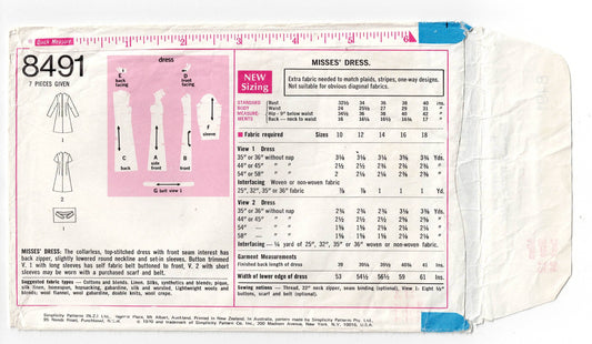 Patrón de costura vintage de los años 60 para mujer Simplicity 8491, vestido ajustado con detalle de costura delantera, talla 12, busto 34 pulgadas
