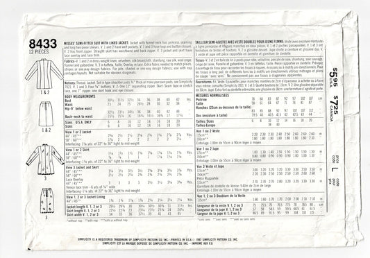 Patrón de costura vintage de los años 80 para chaqueta y falda con cuello de embudo para mujer Simplicity 8433, talla 12