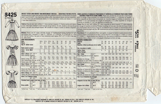 Patrón de costura vintage de los años 80 para vestido de novia con volantes y dobladillo de sirena y mangas abullonadas Simplicity 8425, talla 12