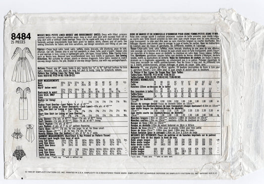 Patrón de costura vintage de los años 90 Simplicity 8484 para vestido de novia con mangas abullonadas, lazos peplum y espalda en V, talla 6-10, doblado de fábrica, sin cortar